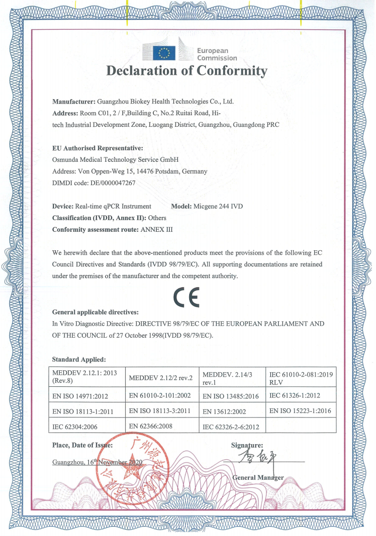 The Micgene 244 IVD real-time PCR instrument independently developed by Guangzhou Yuanqi Health Technology Co., Ltd. has obtained the European CE certification of medical devices, and has officially obtained the pass to enter the European Union market. This marks that Source Health, as a total POCT solution provider, will officially start its journey to the global market.