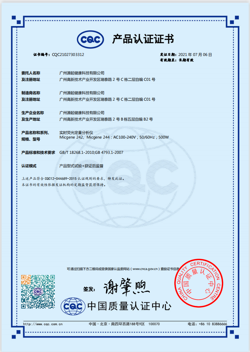 The Micgene 242/244 real-time PCR device was approved by the China Quality Certification Center (CQC) for product safety specifications.